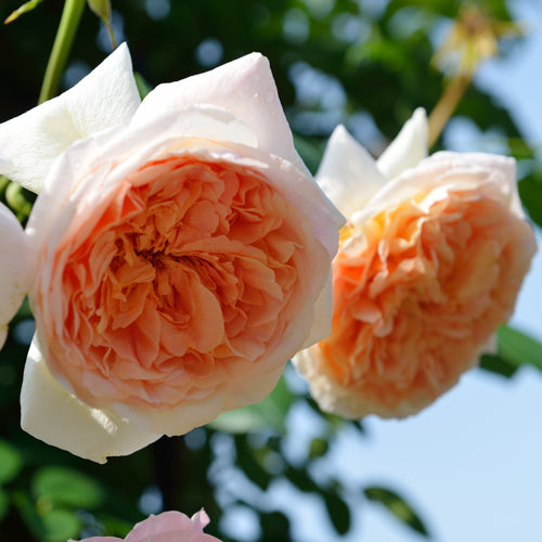 オレンジ、アプリコット、黄色の混じりあった暖かい花色。カップ咲きからロゼット咲きに変化する花は、花弁が多いオールドローズタイプの大輪に。新鮮なフルーツの香りも魅力です。細めの枝が2〜3mになるので、壁面やアーチ仕立てが楽しめます。パピはフランス語で「おじいちゃん」の意味で、デルバール社の創始者ジョルジュ・デルバールが晩年自分で選んだバラ。